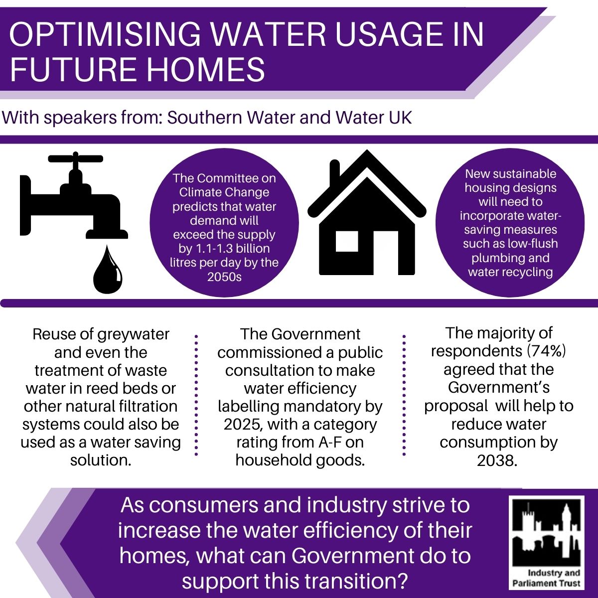 - Considering housing, infrastructure and retrofitting. Whilst water meter users tend to use 50L less water daily than those without, yet not every property is meter-able. Retrofitting properties to allow for greater recycling of water will be extremely important to overcome this issue.